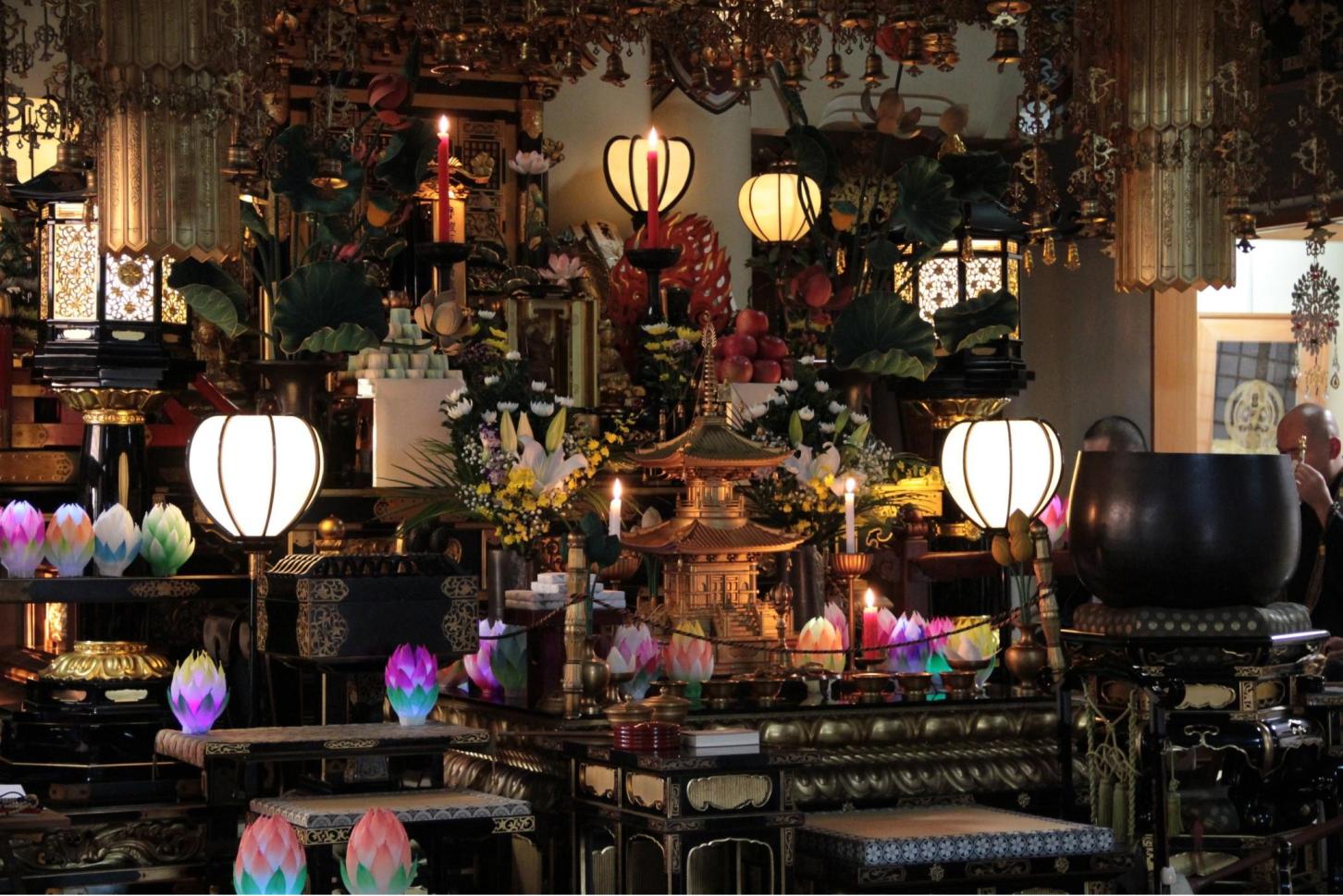 吉祥院では、毎年11月3日の毘沙門天のご縁日に、ご本尊毘沙門天を讃える大祭の法要を檀信徒の皆さんと共に開催致しております。秋の夜の帳の中、参道に並べられた灯篭に照らされ、ほのかに本堂のお姿が浮かびます。堂内の正面に毘沙門さまの御前立(おまえだち)をお祀りして、美しく彩られた蓮の花の灯籠の明かりの中、檀信徒法要を行います。