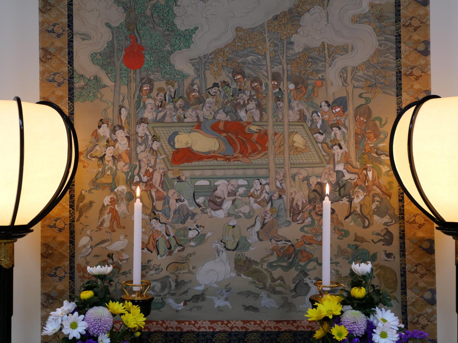 吉祥院では、当日の午前7時より本堂にて檀信徒法要を執り行います。終了後は、一階大広間に荘厳された涅槃図の前でお茶接待を予定しております。